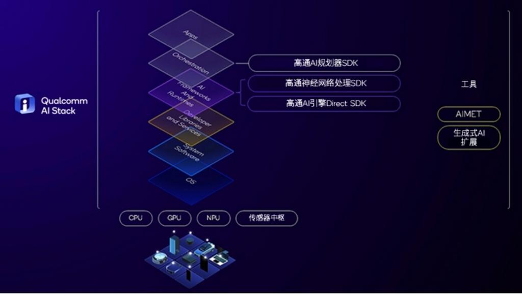 为实现智能体 AI 的落地应用,终端设备对算力、能效以及多模态处理能力的要求很高。凭借多年在边缘计算领域的深厚技术积累,高通打造了一套高效的硬件与软件协同体系。首先是硬件层面,高通通过异构计算架构,将集成定制 CPU、GPU、Hexagon NPU 与低功耗传感器中枢深度融合,为智能体 AI 提供“全能算力”。万卫星提到,通过领先的异构计算系统,高通智能体 AI 的各个模块可以根据不同模块的需求灵活调配资源,协同完成智能体 AI 在终端侧的完整处理流程。